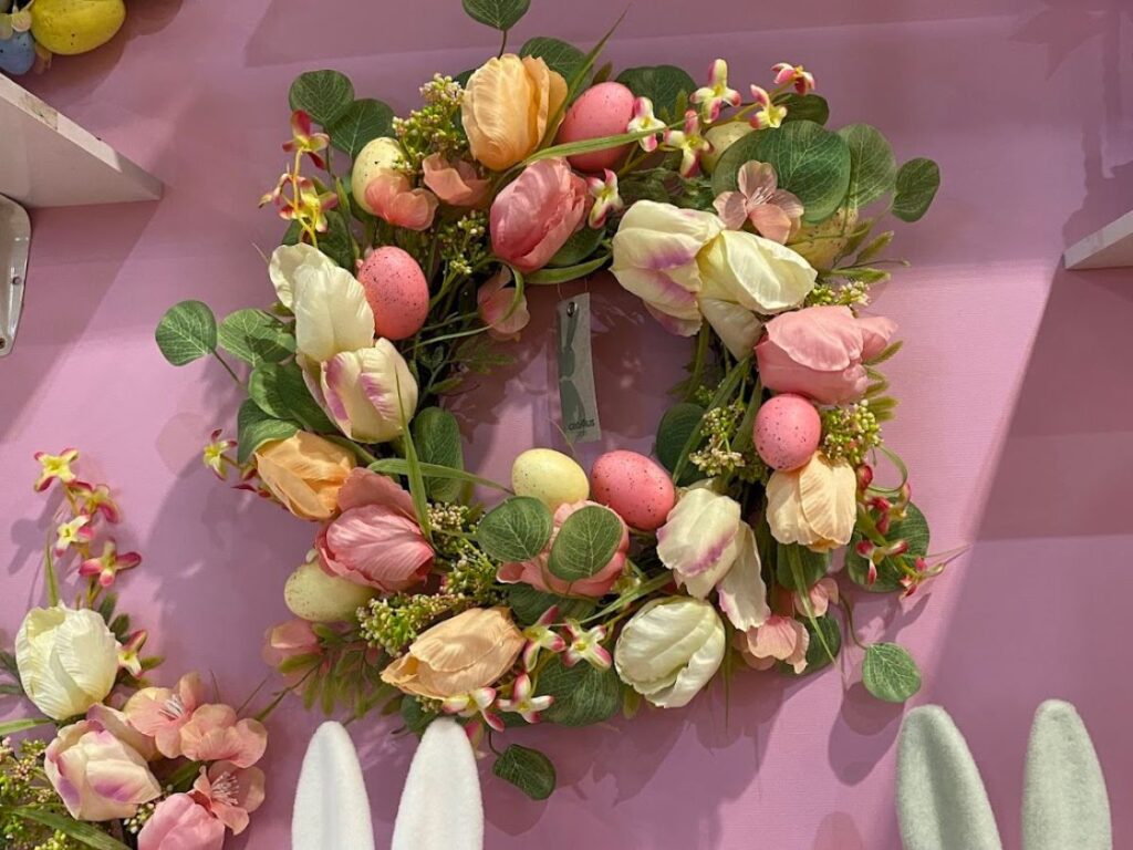 Guirlanda de Páscoa composta por tulipas de seda em tons de rosa e creme, folhas verdes e ovos decorativos rosados sobre fundo rosa.